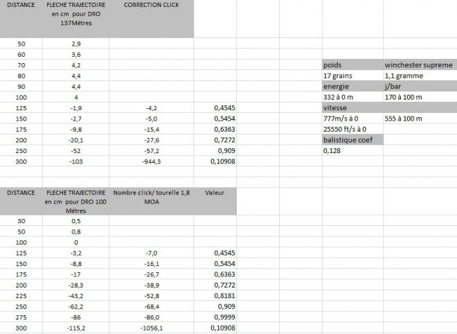 Sachant en effet que pour les calibres de gros gibier on tolère un sommet de courbe de 4cm pour établir la DRO, pour le tir d'oiseaux il faut mieux tabler sur un sommet de courbe de 2cm pour établir cette DRO (distance optimale de réglage). Comme je te l'ai déjà dit, ça fixe ta DRO à 45m environ pour la plus rapide des 22LR et 75m environ pour la 22Mag, lesquels calibres te permettent de tirer sans correction (dans la fourchette +2/-2) à environ 55m pour le premier et 90m pour le second.