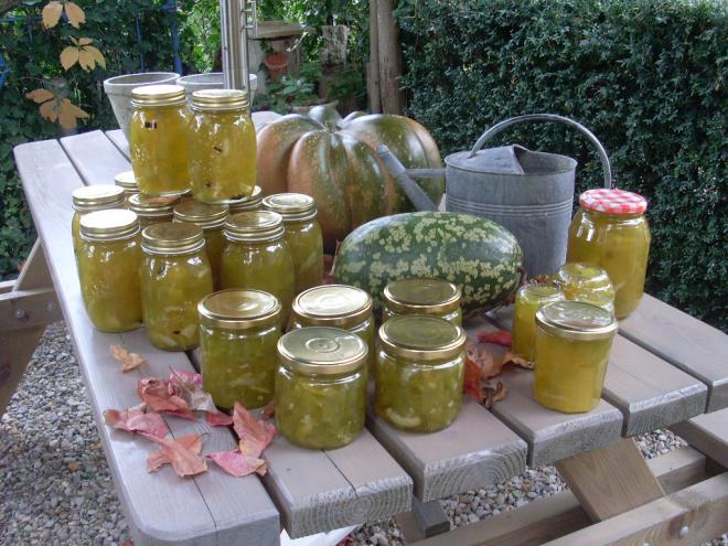 Eh bien ,allez ,la confiture de citre (dans le sud ouest on appelle çà melon d'eau,dans d'autres régions méréville) est dans ses pots bien sage,la tête à l'envers pour l'instant,( en passant je vous signale que cette confiture fait partie des Treize Desserts de Noël),les pots de confit de Palombes sont stérilisés en train de refroidir gentiment,depuis 7h ce matin j'avoue que je sature un peu là.................