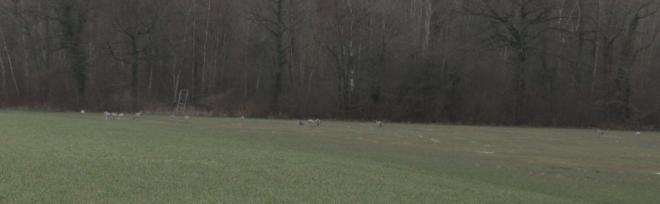 Grues photographiées de loin dans un champ de blé ,grand étang derrière les arbres ,aujourd'hui 12.03.2018
