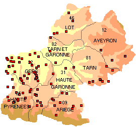 | (09) Ariège (12) Aveyron (31) Haute-Garonne (32) Gers (46) Lot (65) Hautes-Pyrénées (81) Tarn (82) Tarn-et-Garonne | |