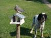 Ma tricolore , à l'arrêt sur une jeune palombe (née en voliere et élevée à la main ) que j'ai mise en liberté autour de la maison